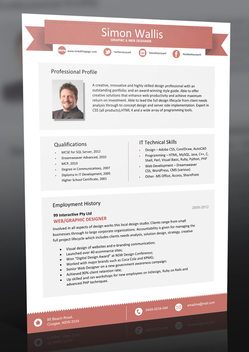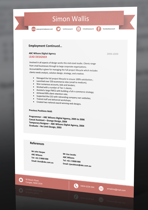 This professional resume template benefits from a clean and clear layout that is based on modern professional resume trends and headers. This careful crafted resume makes subtle use of spot colour without overpowering the resume template. Design for an instant impression.