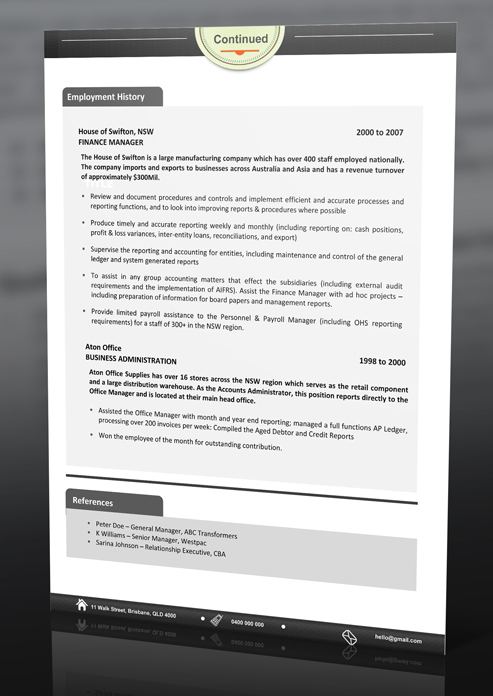 This template benefits from a clean and clear resume layout that is based on modern resume trends and navigation headers. This careful crafted resume makes subtle use of spot colour without overpowering the resume template. Design to make an instant positive impression.